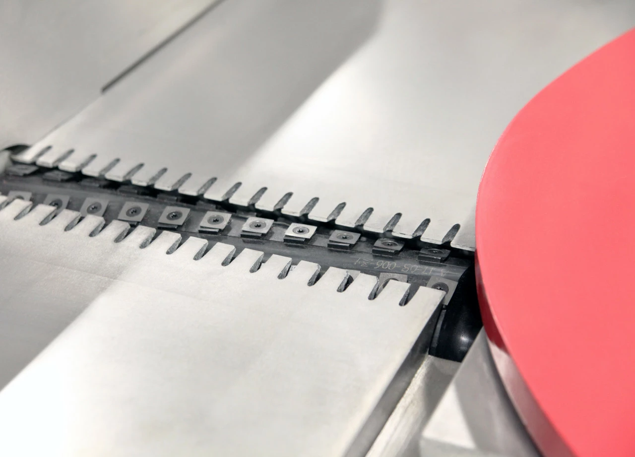The helical cutterhead operates more like a sheer or skew cut taken with a hand plane, as the cutters are positioned at an angle to the feed rate and this shearing action provides a quieter, smoother and superior finish compared to the standard knives and the spiral cutterheads.