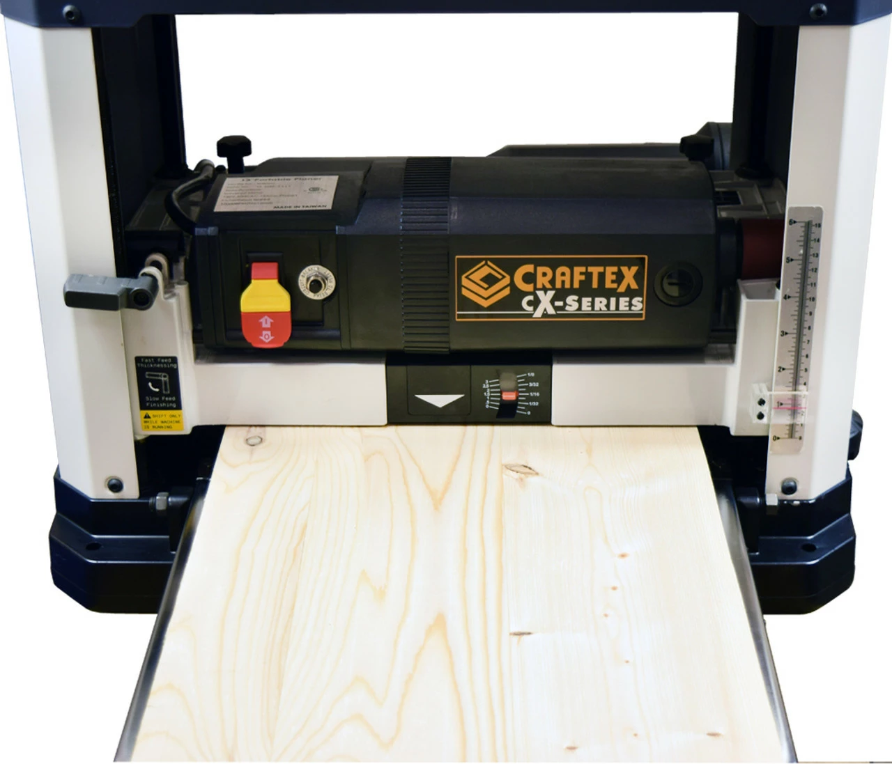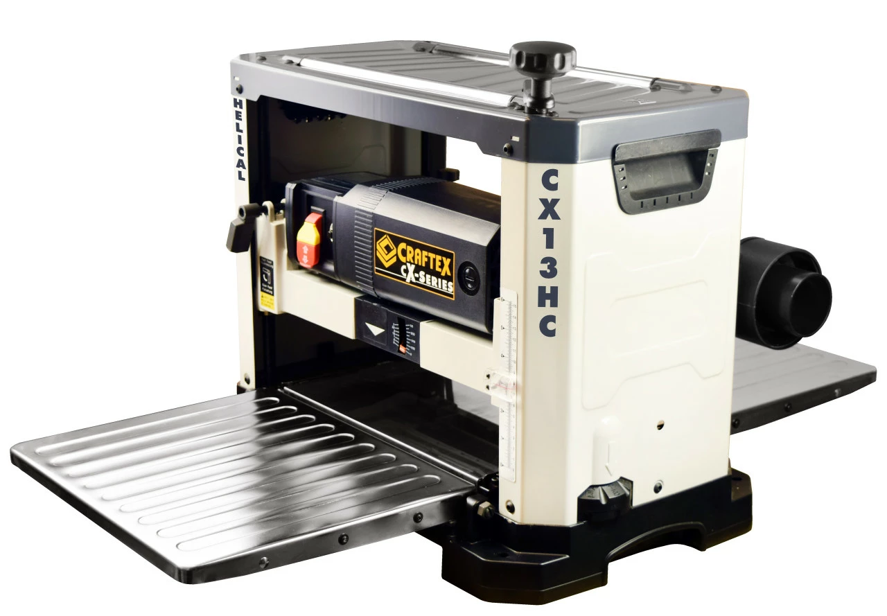 This 13โ Bench Top Planer with Helical Style Cutterhead features a powerful 2HP, 120V motor and 6 row helical cutterhead with 26 indexable cutters giving you power and superior finish you would expect from a stationary machine. This machine is slightly larger than our popular CX125HC 12.5โ planer and it also has some added features. These additional features include 2 speeds, top mounted feed rollers, larger infeed & outfeed tables and pre-set depth stops for repeat cuts at 1/8″, 1/4″, 1/2″, 3/4″, 1″, 1-1/4″, 1-1/2″ and 1-3/4″.