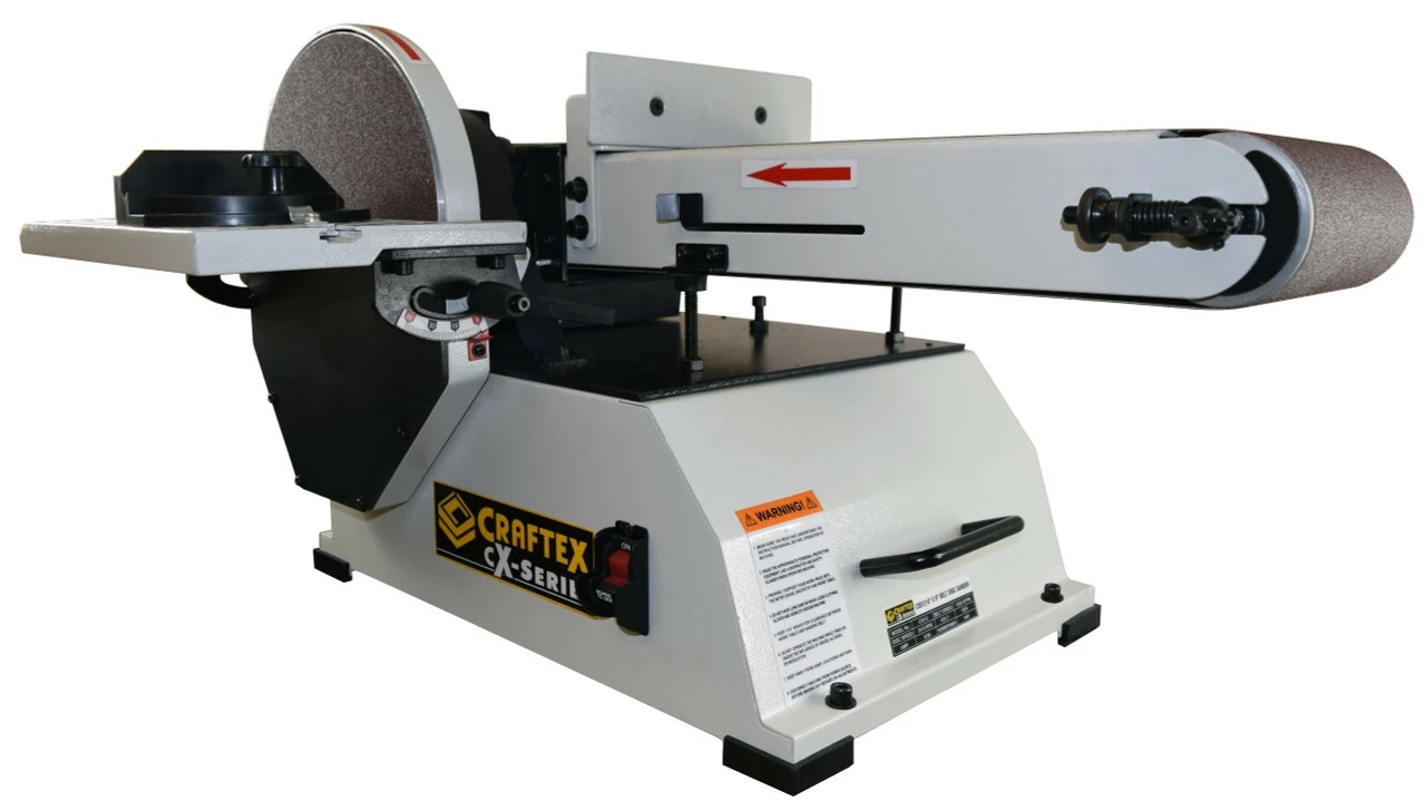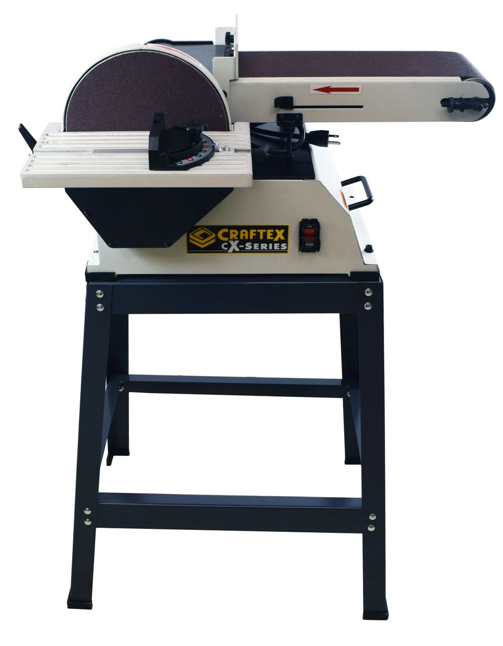 Powered with a 1 HP 8 Amp motor this CX Series belt and disc sander is designed to give you versatility and performance. The 6β x 48β sanding belt operates horizontally (0-degree), vertically (90-degree) or at any angle in between. The 12β x 6β work table provides a solid work surface for sanding and tilts from 0-45 degree. Belt changing, tensioning and tracking all feature a quick release lever for effortless belt changes. The ON/OFF switch on CX512 features a removable locking pin as well as a 2β dust port for dust removal and a sturdy steel stand.