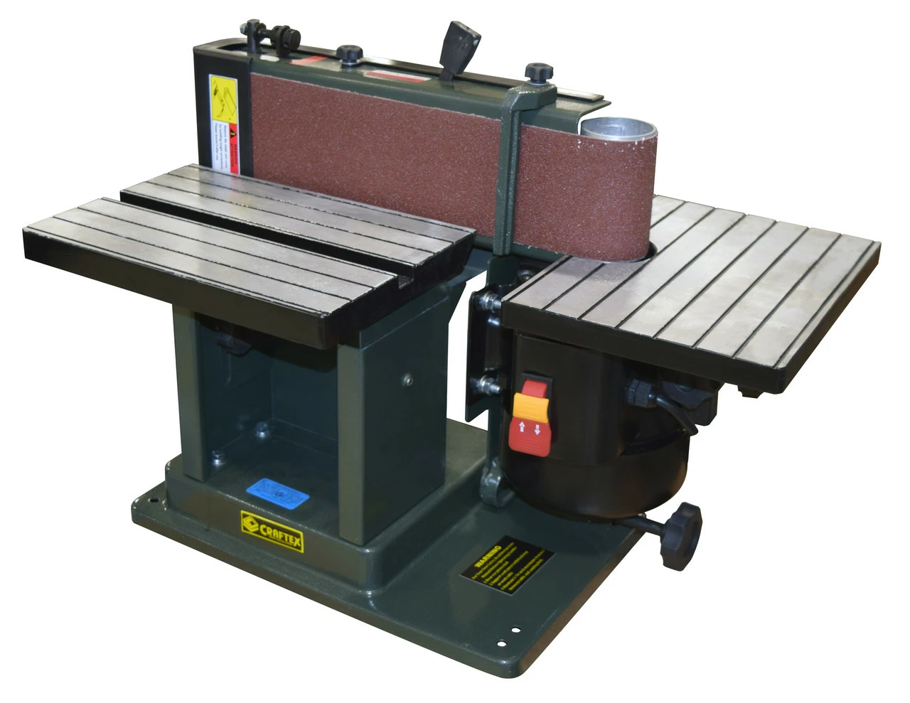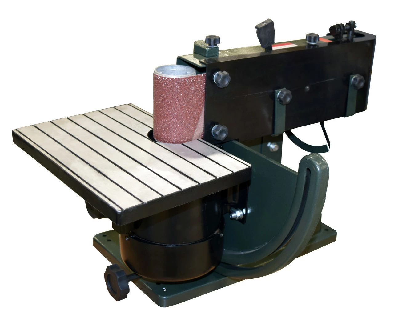 An auxiliary table allows the end of the belt to be used as a contour sander.