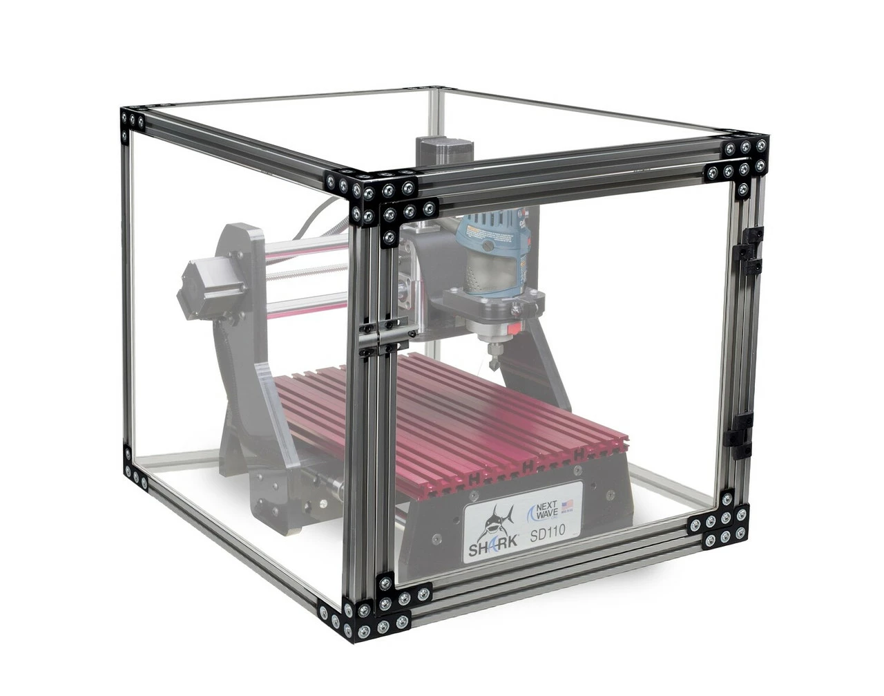 The Safety Enclosure is designed to help control dust, add safety, and reduce machining noise. Made from Aluminum, Plexiglas and all steel connectors and designed to give years of service. Convenient hinged access door with magnetic catch allows for easy material removal or bit changes. Pre-drilled 3” hole for cords allows for the case to be placed on any flat surface. The Safety Enclosure works well for schools, trainers or anyone needing additional safety during demonstrations.