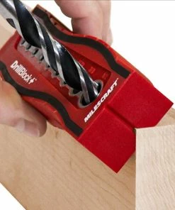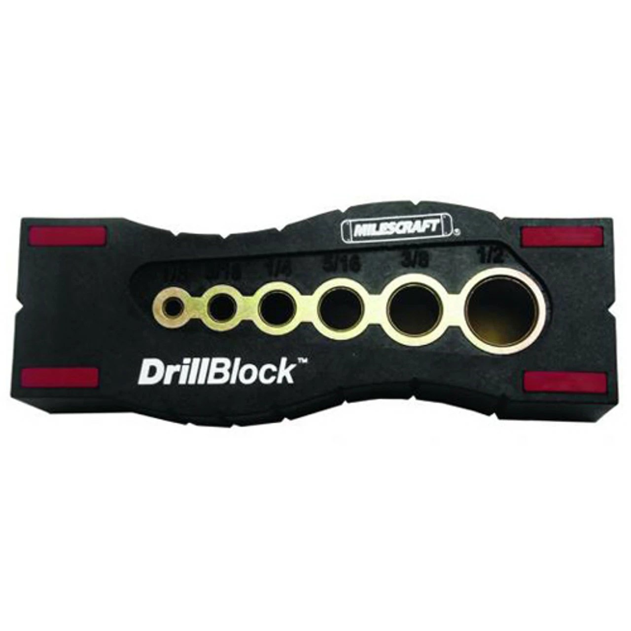 DrillBlock โข allows you to drill straight holes every time. The two product v-grooves allow for usage on corners and even cylindrical surfaces too. The inserted solid metal guide offers the six common drill diameters: 1/8โ, 3/16โ, 1/4โ, 5/16โ, 3/8โ, and 1/2โ. The metal guide is held at a tight tolerance and allows you to drill a hole 90 degrees to any surface, centered on a round item or even directly into the corner of your project.
