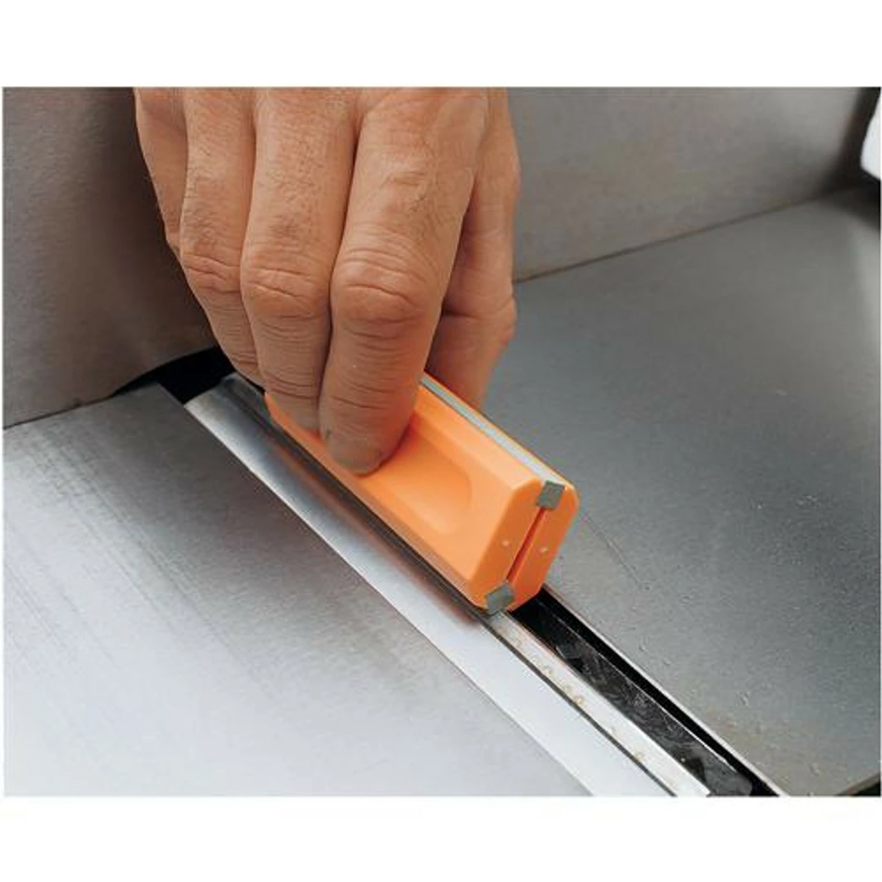 Sharpen planer and jointer knives to a razor keen edge without removing them from cutterheads. The honing tool features two 400 grit stones, a flat stone for sharpening bevels, and a diagonal stone for flat edges. Each stone has four surfaces, which can be adjusted to provide a fresh sharpening surface.