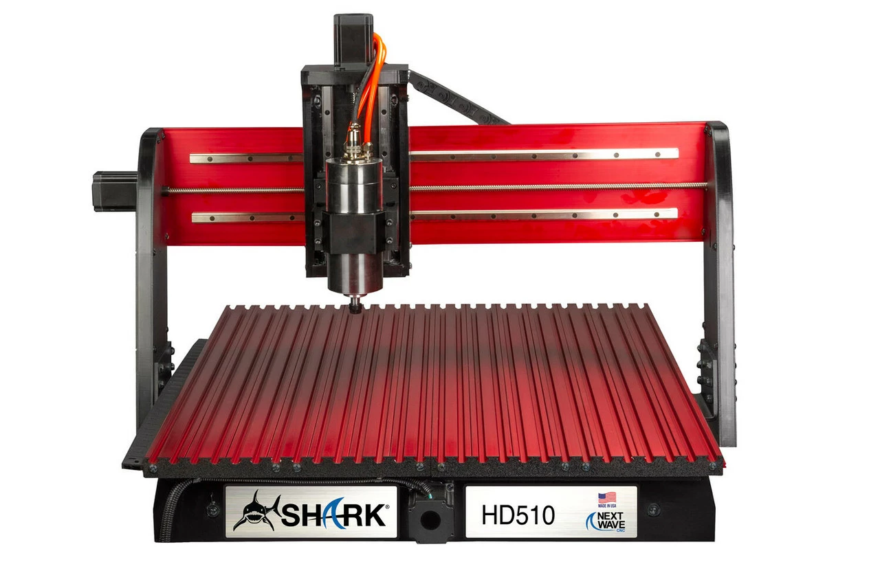 Built with industrial grade components, the Shark HD510 also features a heavy-duty aluminum and steel reinforced gantry, a new extruded aluminum router mount system, interlocking aluminum table, linear rails and guides on the gantry, and anti-backlash, wear-compensated lead screws on all axis. The Shark HD510 is the perfect tool for carving or machining a large variety of projects made from wood, soft metals, composites, or plastics. The Shark HD510 is fully compatible with Next Wave Automationβs extensive product line of additional accessories, such as laser, 4th axis, scanner, and more. The Shark HD510 is made in the USA, comes with a full one-year warranty and includes lifetime technical support so you can buy with confidence.