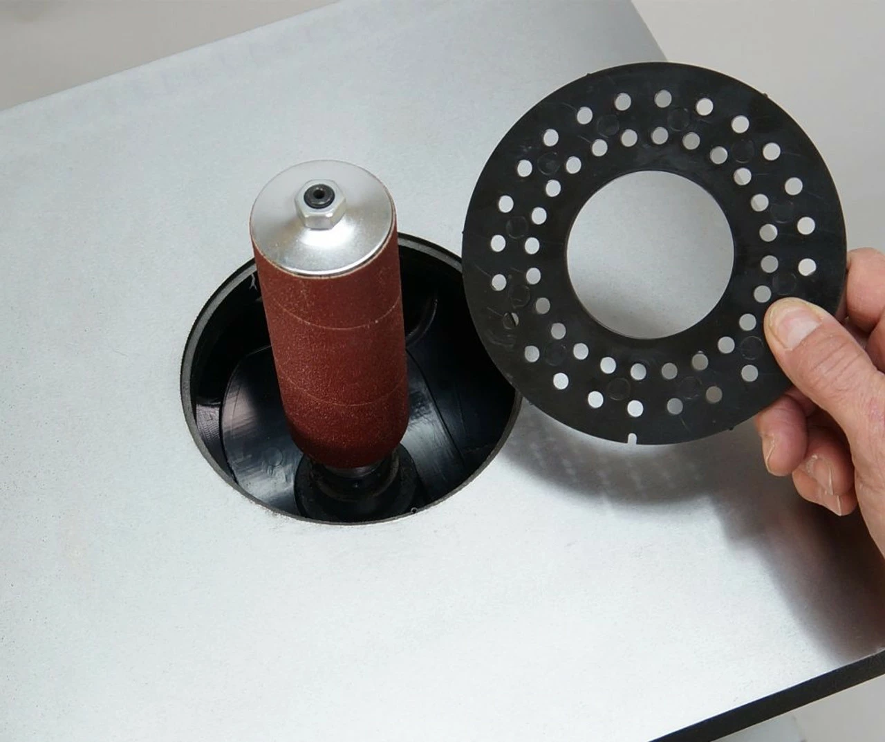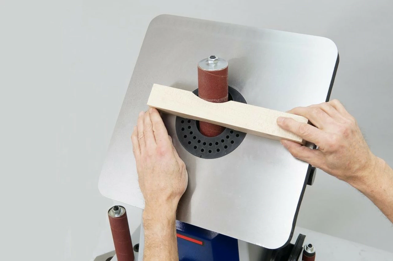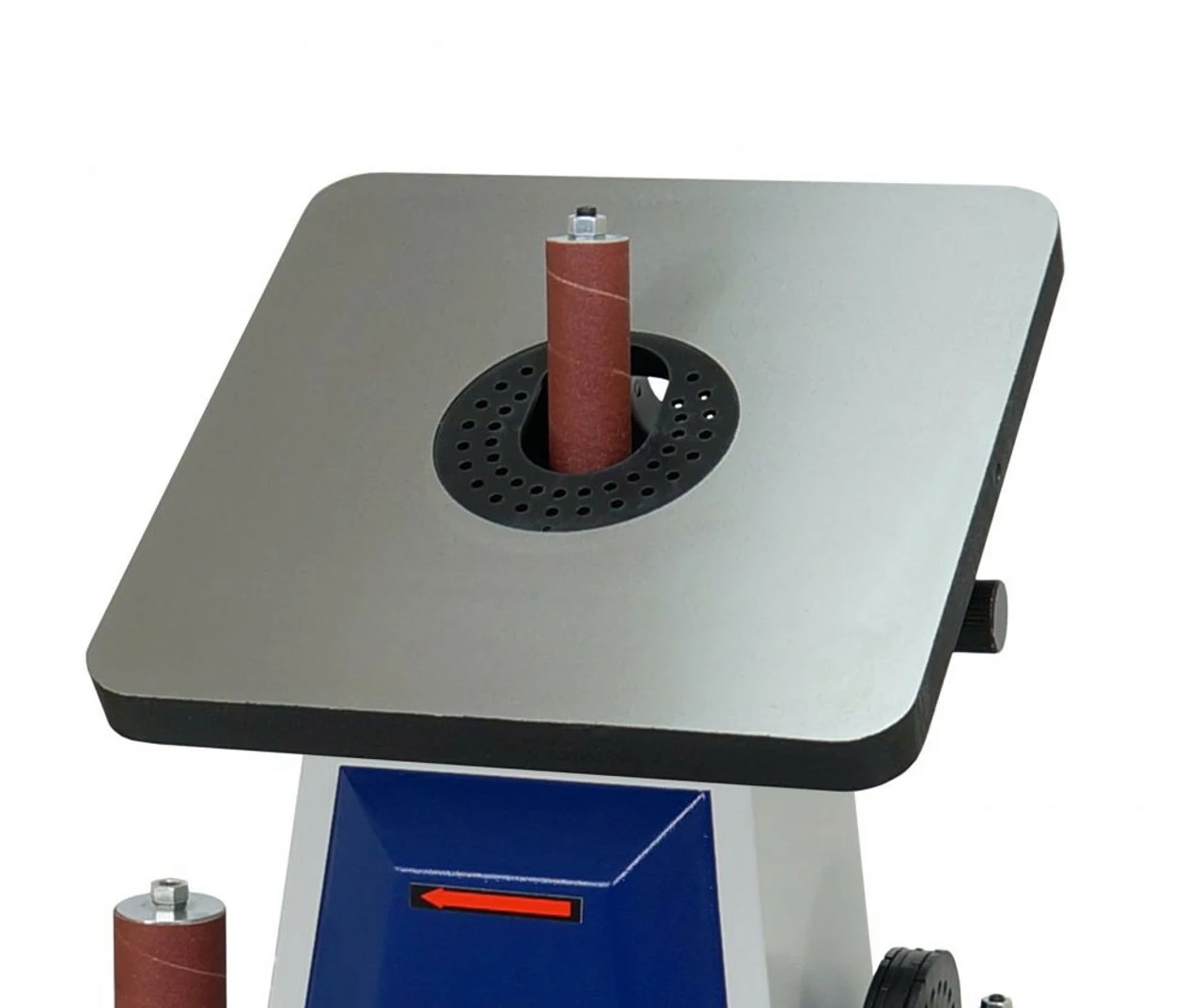 Oscillating Spindle Sander 50300 is a specialized sander for the fast and accurate sanding of curved board edges. Abrasive sleeves mounted on the machine’s spindles oscillate up-and-down 15/16″, 29 times per minute while the spindle spins, providing more efficient abrasive cutting action. Powerful 1/2 HP motor, all steel gearing, ample cast iron tilting table, metal housing and 5 spindle diameters (1/2″ – 2″) with 6 table inserts make this a valuable machine for every shop. This machine uses 4-1/2″ long abrasives.