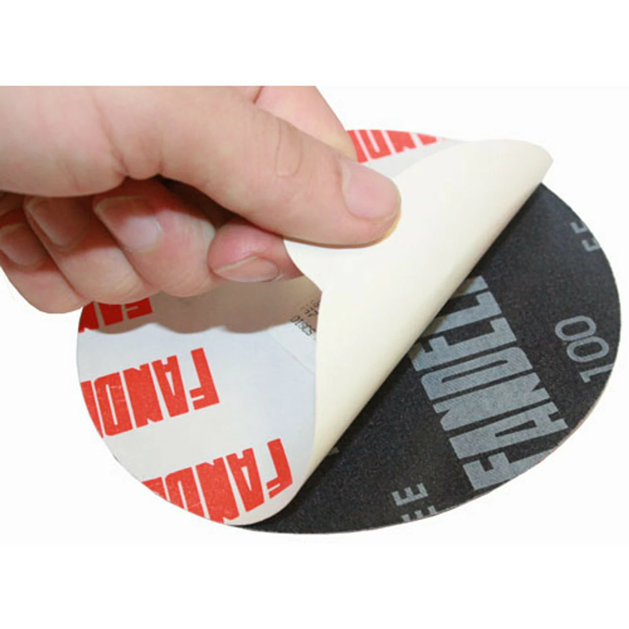 This sanding disc uses tough Aluminum Oxide grain. Just peel the paper at the