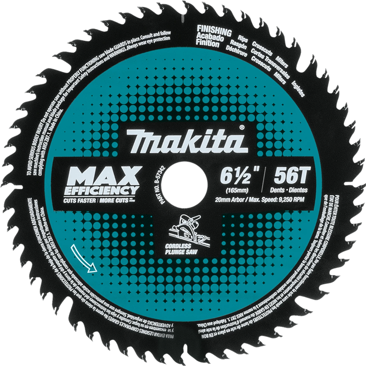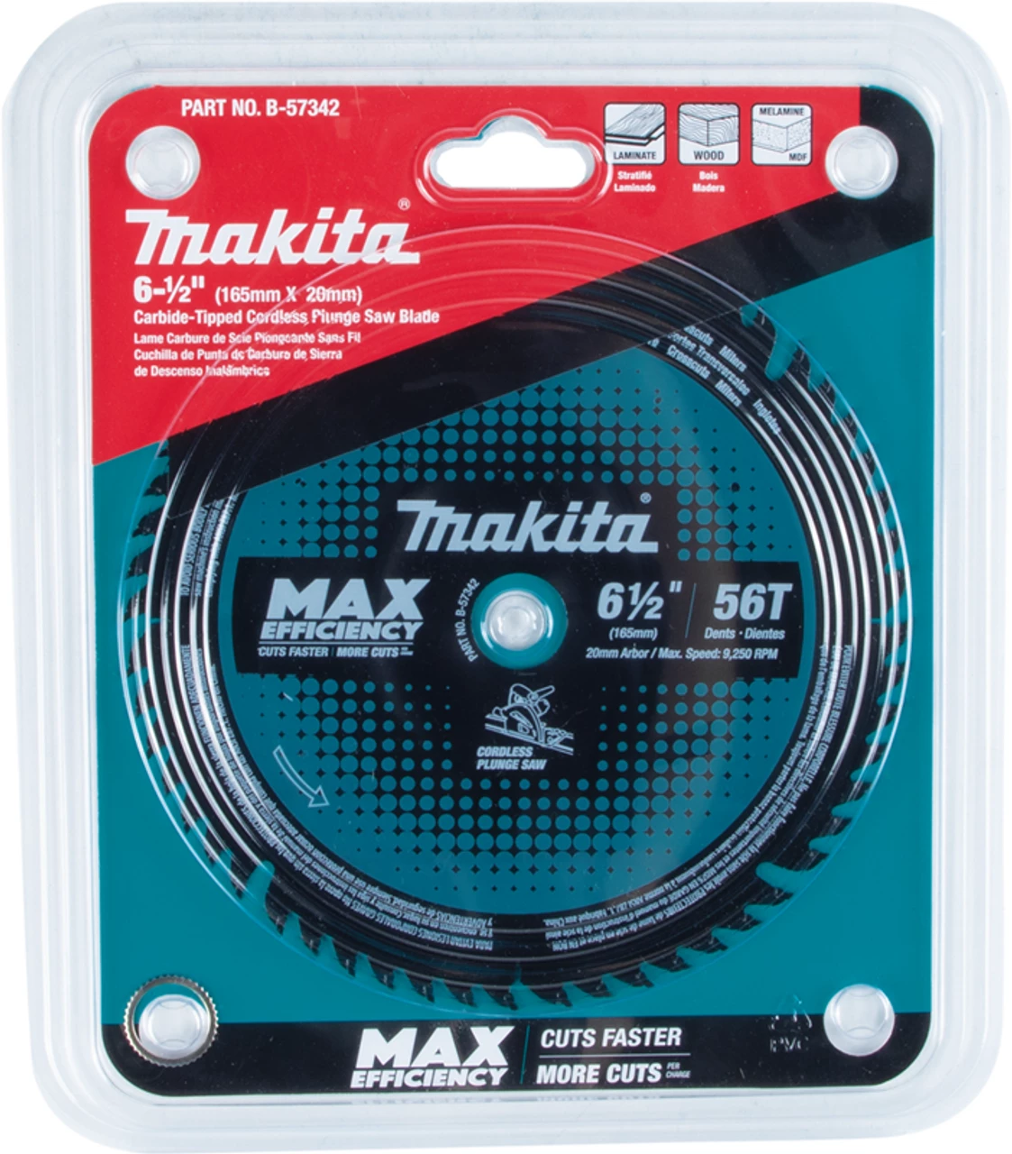 A plunge circular saw and guide rail is a more portable option over a table saw for smooth, accurate, and splinter-free cuts in plywood and other large wood panels. Makita offers the 36V (18V X2) LXTยฎ plunge circular saw, and Makita has an expanding range of blades so you get the right accessory for the job. The 6-1/2โ 56T Carbide-Tipped Plunge Saw Blade (B-57342) is ideal for cutting wood, MDF, and laminate materials. Key features include the thin-kerf design and fluorine coating to reduce pitch build-up โ and both features are engineered for less drag and up to 140% more cuts per battery charge over standard Makita corded plunge saw blades (B-07353). The blade also features high-grade carbide tips for durability, and laser cut slots for quieter cutting and less vibration. Each blade is fully hardened and expertly hand-tensioned from steel saw plates for true cuts.