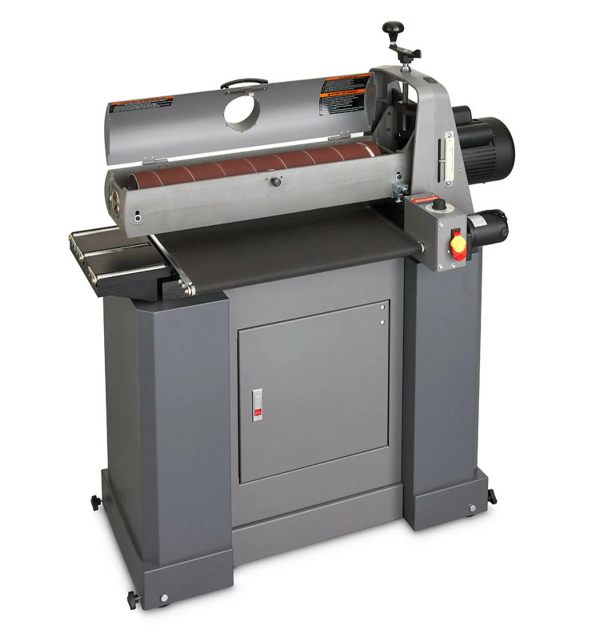 INTELLISANDβ’ Technology: Automatically adjusts conveyor speed based on load. Prevents gouging, damaging, or burning stock. Provides consistent finish even with varying grain pattern and density. Greatly increases abrasive planing and dimensioning speed. Flatness Guarantee: Precision-flattened steel conveyor bed reinforced with four steel cross sections for no βflexβ in conveyor, guaranteeing flatness to less than .010β³ across the width of the sander. Abrasive conveyor belt offers the best grip for raw wood, giving you the ability to accommodate stock that is much shorter or thinner. Patented Abrasive Attachment System effectively tensions the abrasive wraps, preventing loose abrasive and overlap. Easiest access to the abrasive fastening system of any drum sander! Extra-wide space to access fasteners to eliminate the need for special tools. The self-cooling drum prevents overheating and extends abrasive life. Tension rollers are adjustable in height and hold down pressure, eliminating snipe. Excellent dust extraction as dust cover is formed to shape of the drum. Metal, not plastic, is formed to maximize airflow and dust extraction. Heavy-duty cast iron construction for strength, rigidity, and reduced vibration. Mobile Base allows for stand and machine to be to move easily. Optional Accessory Available: DRO (digital read out): maintain material thicknesses to increase accuracy and quality.
