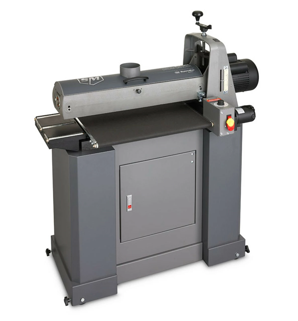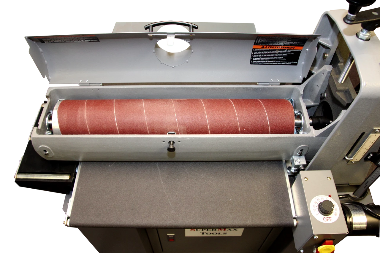 The SuperMax 25-50 Drum Sander is the largest open-ended drum sander on the market. Sand 25β³ in a single pass, and up to 50β in a double pass. Expand the scope of projects you can complete while increasing the speed and consistency in which youβre able to do them! The 25-50 Drum Sander is the newest member of the SuperMax Tools drum sander family which was designed with new features to improve productivity. Patented Quick Adjustment Lever: reduces set-up time. Turbo Vented dust port increases airflow to your dust collector by 15%. The rear placement of the Gear Motor: improve conveyor belt tracking. These new features complement the same great features SuperMax Tools have provided for years. Patented Fast Lever: allows quick adjustments for wide and narrow stock INTELLISAND Technology prevents gouging, damaging, or burning material. Features: Simple alignment feature Just one nut will adjust the conveyor to parallel the sanding head, making aligning the conveyor to the sanding head fast and easy. Indexed alignment setting Has an indexed alignment setting for narrow and wide stock. When sanding stock wider than 25β, the index lever will properly adjust the conveyor for flawless wide sanding. Easy height adjustments A thrust bearing below the handle and a nut positioned above prevents the drum from moving out of the set position while sanding. No backlash or slop in the height adjustment mechanism allowing easier and smoother height adjustments. Drum will never go βout of alignmentβ The drum carriage is bolted to the base, preventing any movement or alignment issues.